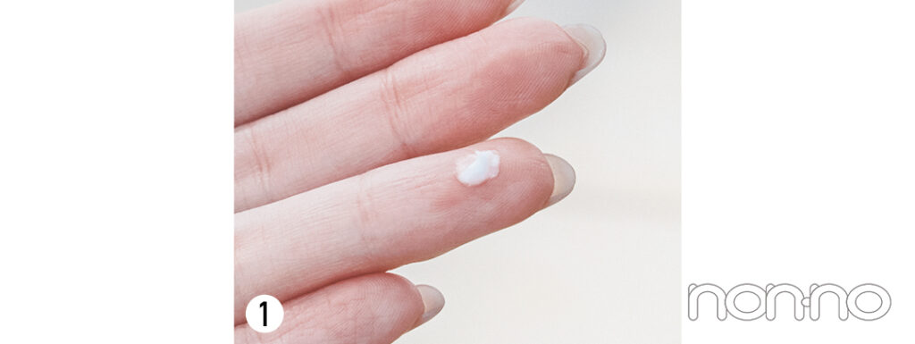 米粒大くらいの量を薬指に取り、反対の手の薬指とこすり合わせて温めてからスタート。