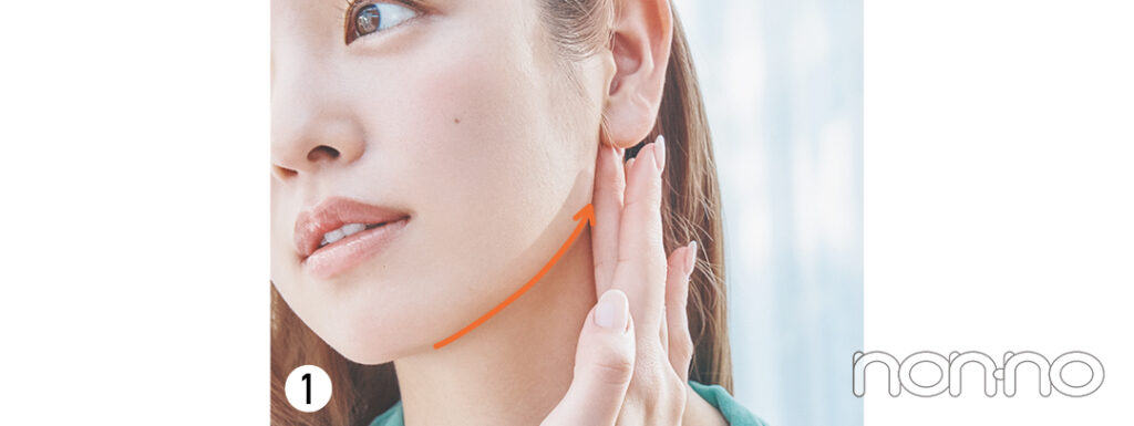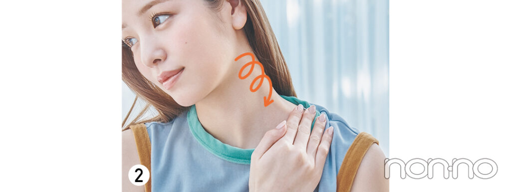 アゴ下から耳たぶの裏のくぼみまで、手のひらを使って優しいタッチでさすり上げる。