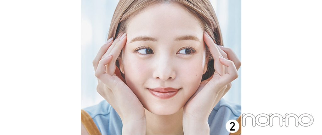 こめかみに中指と薬指を置き、圧をかけて。同様に耳上に向かって何度かプッシュし滞り解消。