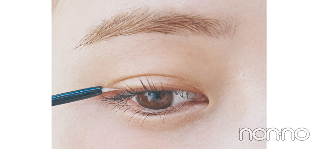 上下のまつげの根元を中心に美容液をオン。上まぶたは目頭側と目尻側の2回に分けて塗ると、塗り漏らしがなくおすすめ。