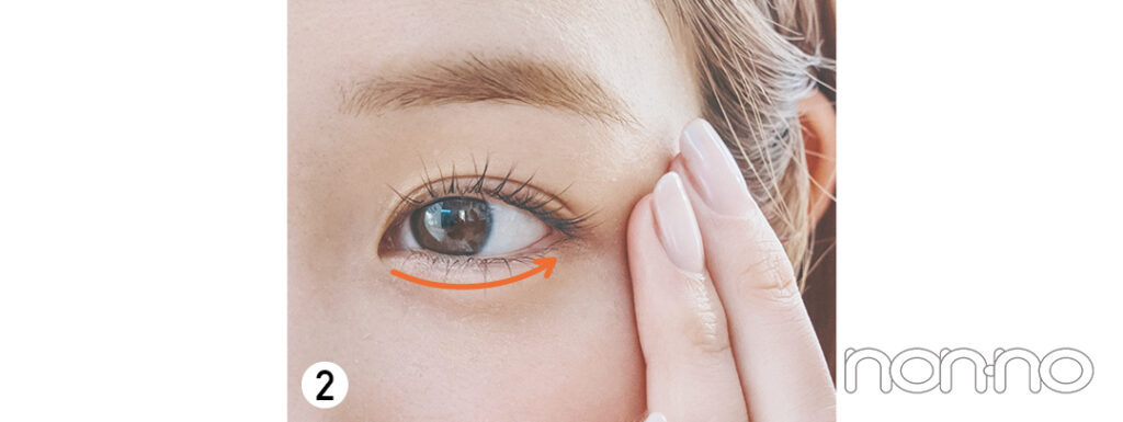 クリームを足さずに、指に残ったものを上まぶたの内側から外側方向へなじませる。