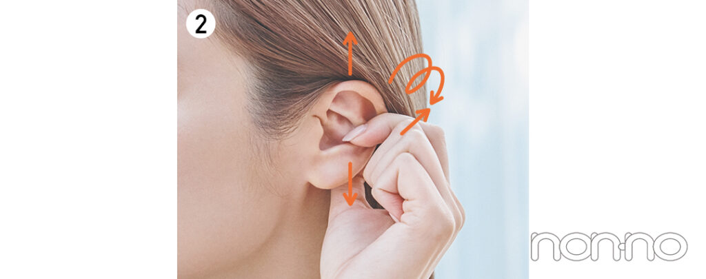 耳の中央付近をつかみ、上、斜め後ろ、下の順に引っ張ってからぐるぐると回す。5セット行うとむくみ目もぱっちり!