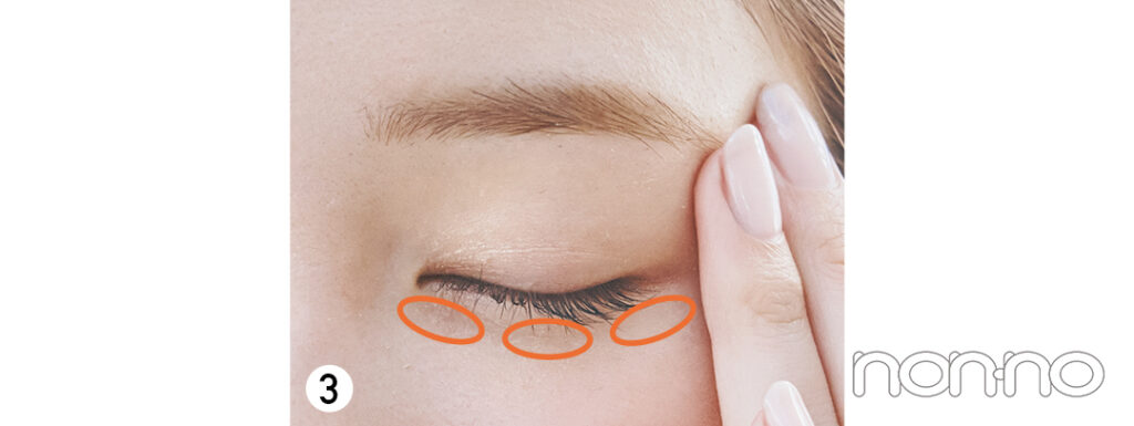 クリームを下まぶたの数か所に点状に置き、中指と薬指で優しくスライドしてのばそう。