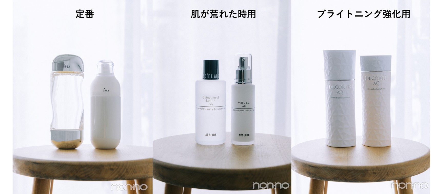「『イプサ』はデイリー使いに。みずみずしい化粧水と、私の肌に合わせて選んでもらった化粧液をスタンバイ。化粧水はコットンがひったひたになるくらいたっぷりと使うのがポイント」