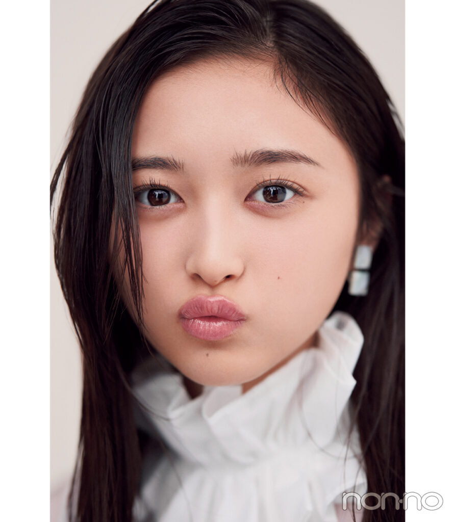 「プライベートでの定番は深みのあるシックなレッドリップ。よく『キラキラのピンクをつけてそう』って言われるけれど、自分ではそんなイメージが全然わかなくて(笑)。でも今年はグループに後輩も入ってくるし、頼れる先輩になりたい。そして新たな一面も見せていきたいという誓いを込めて、王道アイドルなツヤっぽピンクを自分のものにしたいですね。いよいよ20歳になる今年、私が憧れるのは"子どもっぽい大人"。経験値が上がると回り道を避けて正解を選びがちにもなるけれど、いい意味での無鉄砲さやおちゃめさ、挑戦心はずっと持ち続けたい。目の前のことに全力で取り組む気持ちが私の原点なので!」