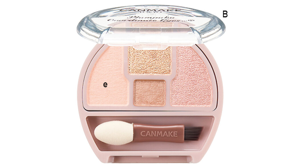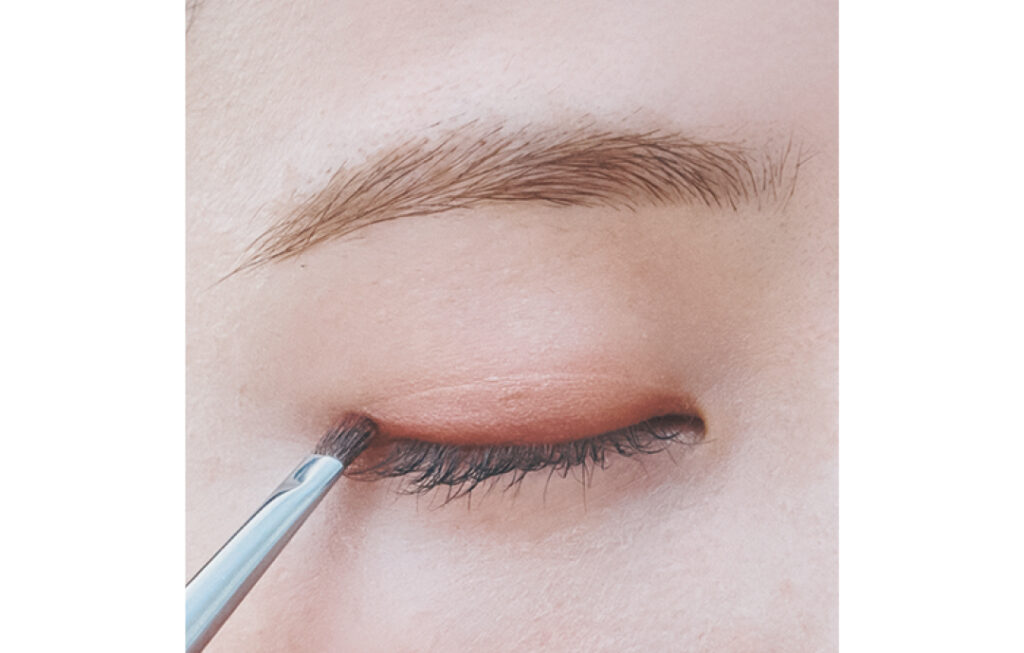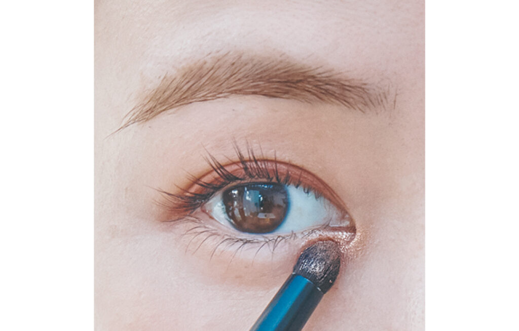 Dで上まつげの根元を少しだけ埋める。Aのcに近い色で、アイシャドウをさらに引き立てるよ。