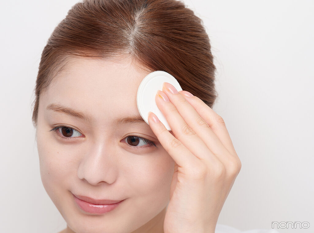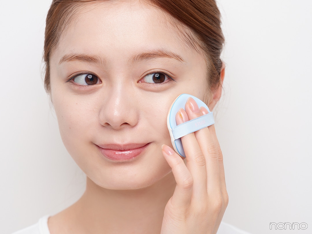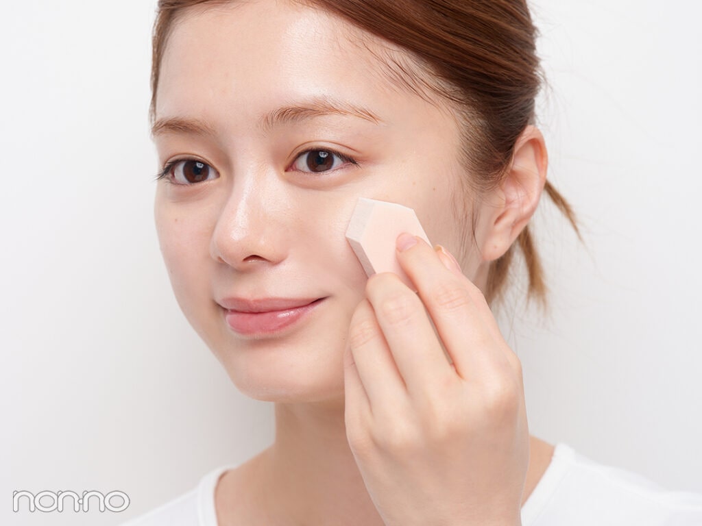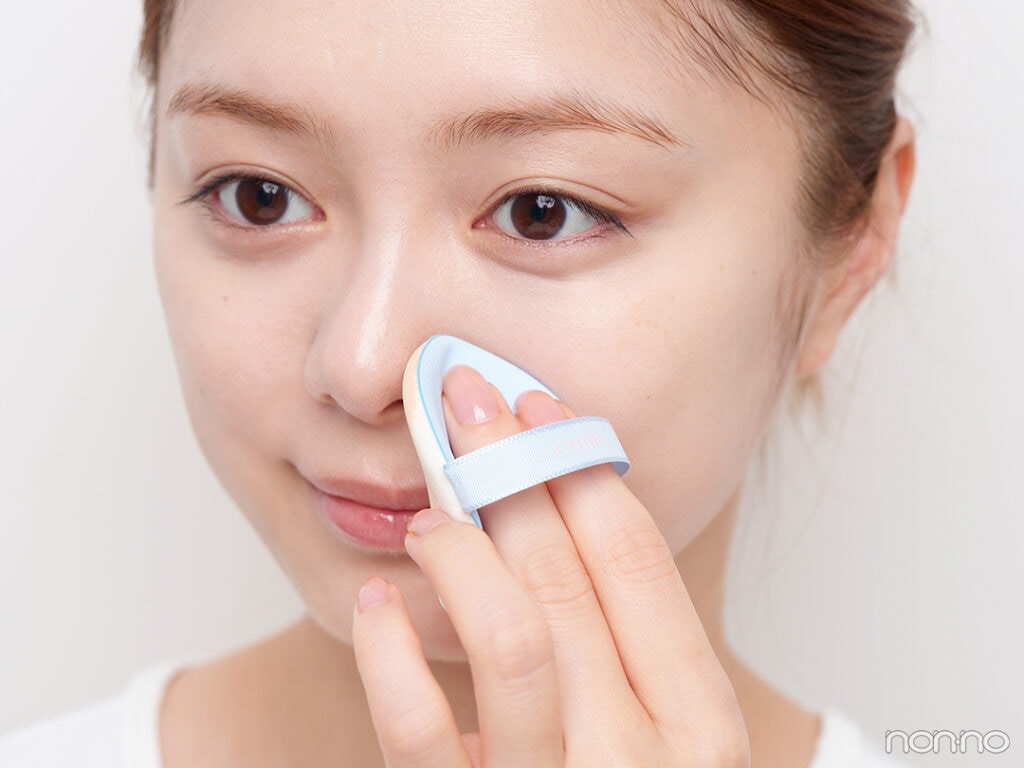 ファンデをパフに取ったら一度裏ぶたなどでトントンと量を調節し、顔の広い部分から軽くタップするように塗り広げる。顔の中央から外側に向けてなじませていくと、立体感のある仕上がりに。