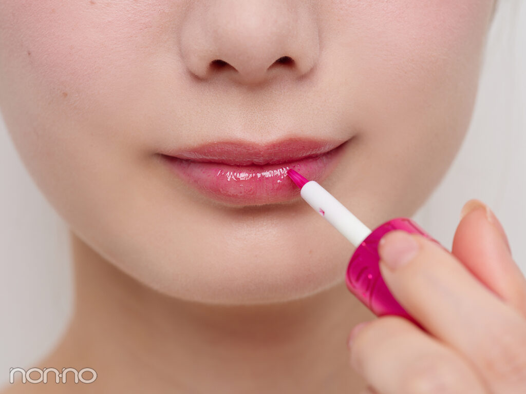 ウォーターベースのティントリップは特に密着度が高くおすすめ。Gを唇の内側が濃くなるよう、グラデーションを作るイメージでなじませる。たっぷり色づけたら上下の唇を軽く合わせて完成。