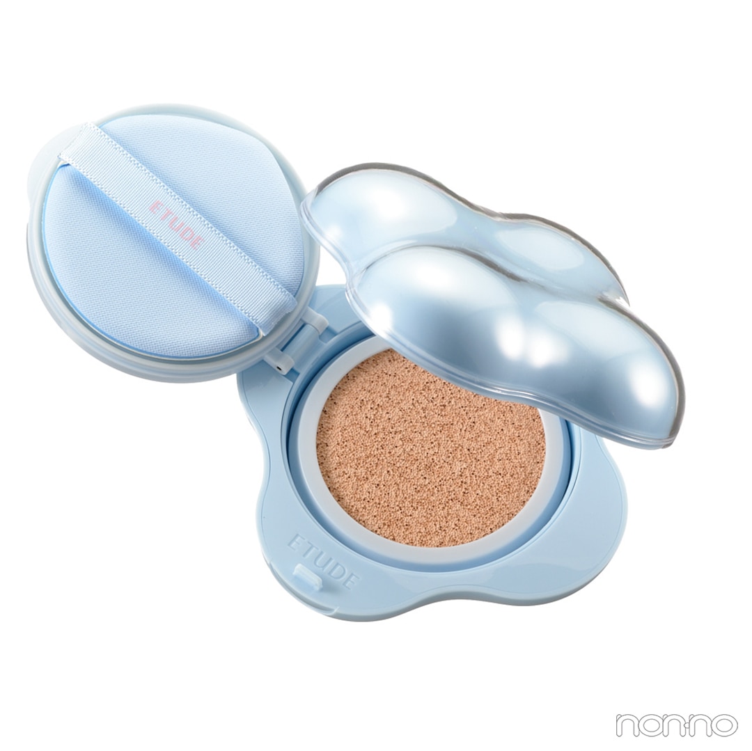 セミツヤな仕上がりが長時間持続。薄いヴェールをかけたようにさりげなくトーンアップを叶え、ブルーパウダーが肌のくすみや色ムラを自然にチューニングしてくれる。クラウドフィルタークッション SPF42・PA+++ 全4色 ¥2750/エチュード