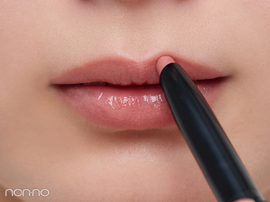 フレームの色落ちを防ぐために、まずはFで上下の唇の輪郭をふちどる。上唇を少しオーバーめに描くと、ぷるんとボリュームアップ。