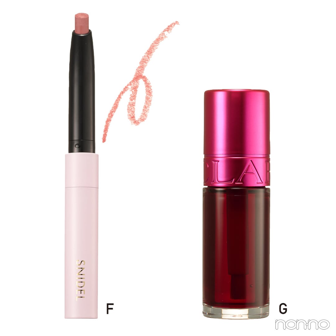 Fリップライナーとしても、リップスティックとしても使える絶妙な細さ。唇に張り付くようなサテン質感が心地いい。ピュア リップ シェイパー n 02 ¥2530/スナイデル ビューティ G水彩インクのように染め上げ、ぷっくりとした唇印象をキープ。食事しても落ちにくい。ウォーター リップ ステイン N 04 ¥3740/クラランス