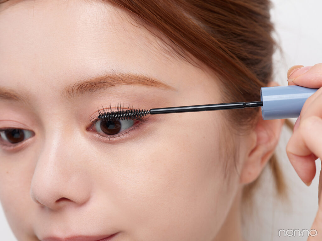 ビューラーで上まつげをカールしたら、根元にブラシを当ててジグザグと左右に数回動かしてマスカラ液を絡め、毛先に向けてスッととかす。下まつげは根元から毛先へ軽くとかすだけでOK。
