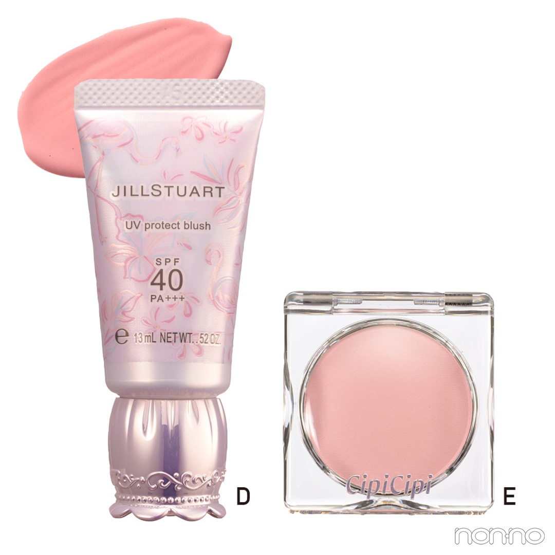 Dじゅわんとにじむ血色感を再現。日焼けしやすい頬を紫外線から守るUVカット効果つきが頼もしい。UVプロテクト ブラッシュ 02 SPF40・PA+++ ¥3300/ジルスチュアート ビューティ(限定発売中) E毛穴を埋める球状パウダーを採用し、ふんわり毛穴レスな頬に。汗・皮脂も吸着してサラサラ肌をキープ。シピシピ ポアレスチーク 01 ¥1430/Rainmaker