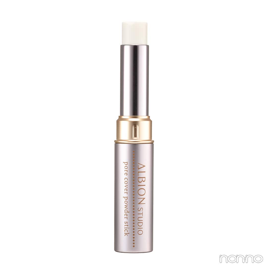 毛穴が気になる部分になじませるだけで、凹凸もテカリも一切感じさせないサラサラ肌へ。アルビオン スタジオ ポアカバー パウダースティック 2.7g ¥3850/アルビオン