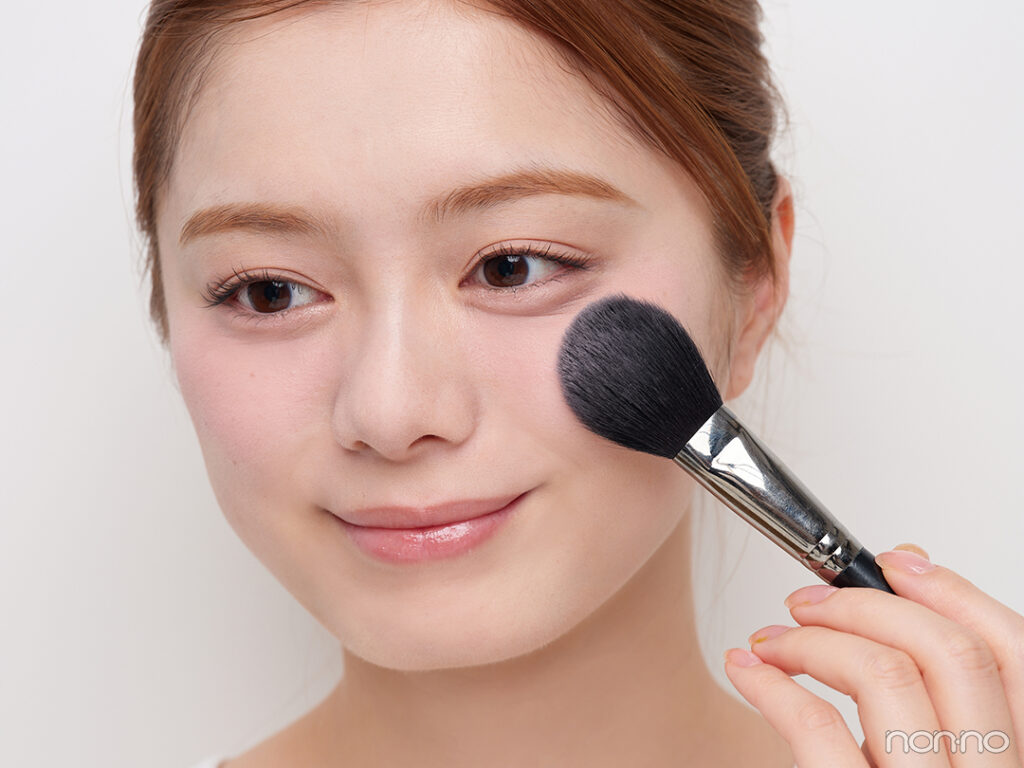 Eをチークブラシにしっかり含ませたら、ブラシの先端ではなく側面を使ってDと同じ範囲にふんわりとなじませる。