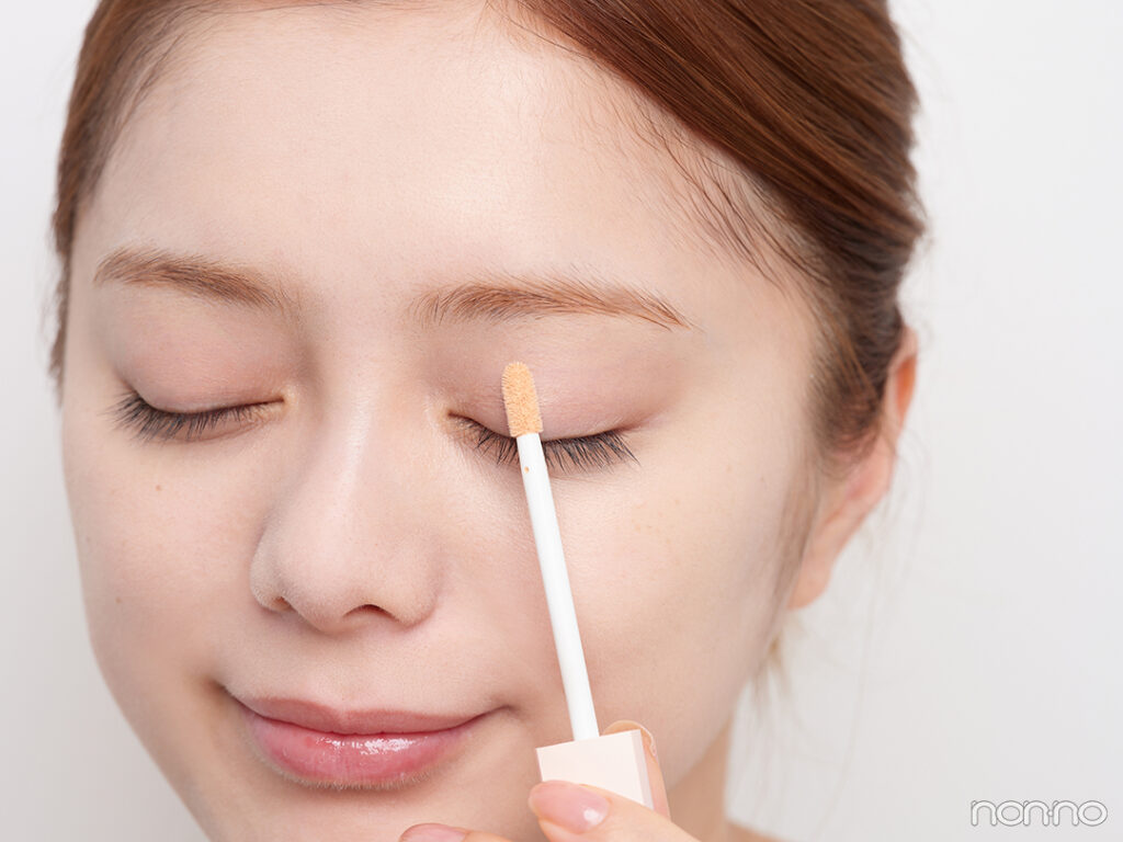 チップを軽くティッシュオフして液量を調整し、上下のまぶたにすべらせながらオン。指でトントンなじませて、ムラを整えながらFIXさせる。下まぶたの目尻側のキワは瞳の水分などで崩れやすいので、特に念入りに密着させて。