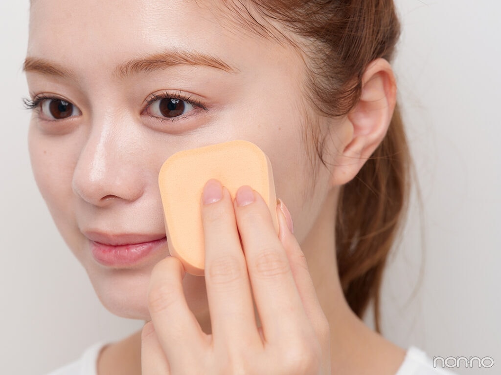 BBスプレーをスポンジにとり、顔の中央から外側に向けて素早くすべらせながら塗り広げる。圧をかけすぎず、軽やかに動かすとムラなく均一な仕上がりに。