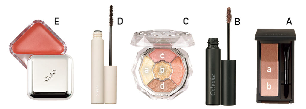Cのaをアイホール、cを涙袋、中央上下にb、上目尻にdでラインを。まつげ上下にDを塗る。