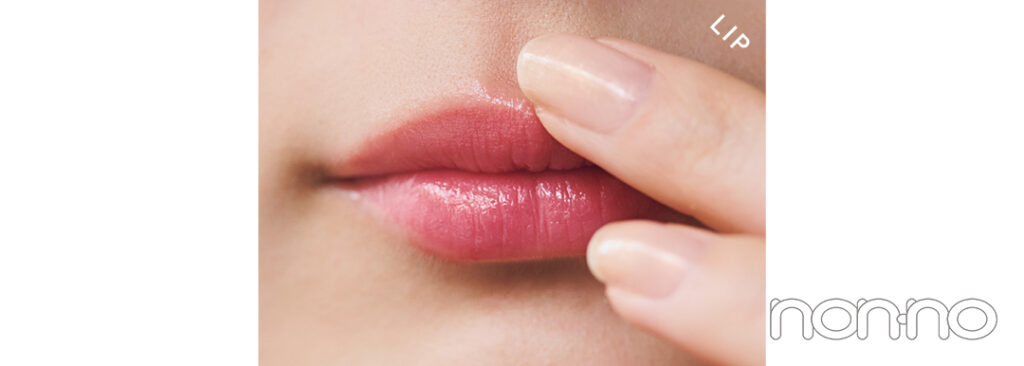 チークと同じEをまず唇全体に指で広げ、山の上を少しはみ出すようにオーバーに重ねる。