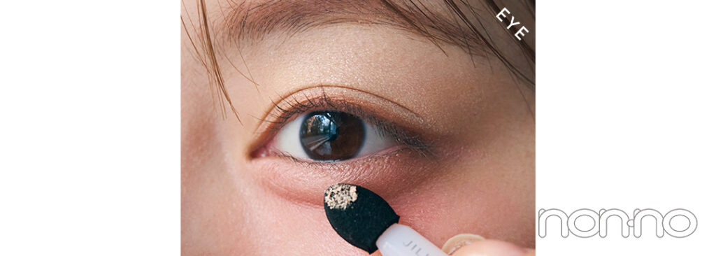 Eを指先に適量取ったら、目の下に数か所置いてからトントンと逆三角形に広げていく。