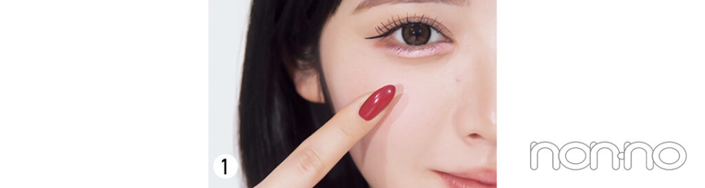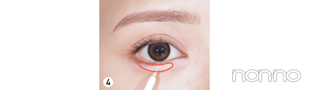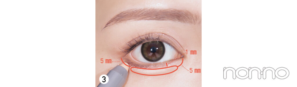 Cを涙袋のふくらみにオン。目頭と目尻はそれぞれ5mm、目のキワから1mm程度空けてのせるのがポイント。