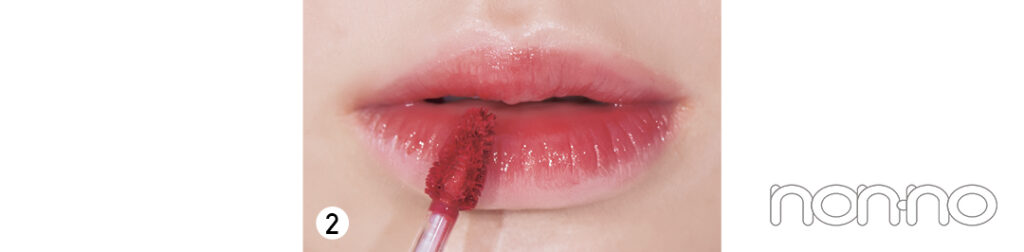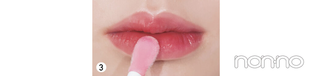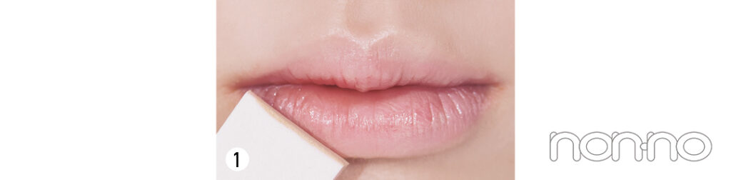唇の輪郭よりやや内側に、薄〜く色をつけるようにAを塗る。中央のみポンポンとAを濃く塗り重ねてグラデリップに。