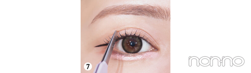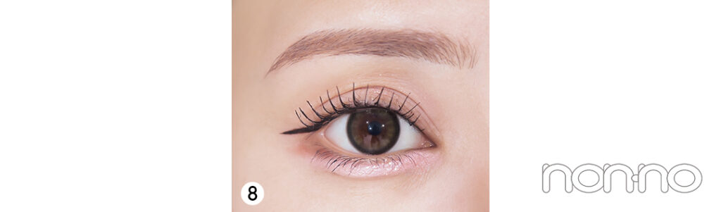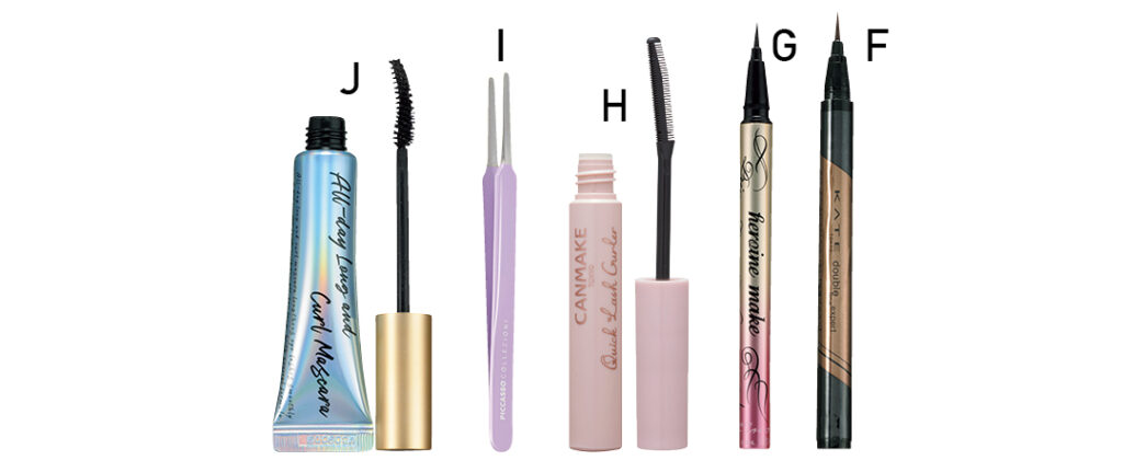 ⑦で作った束が乾いたら、Jを丁寧に塗り重ねてさらに束感を強調する。下まつげ全体にも同様に塗る。