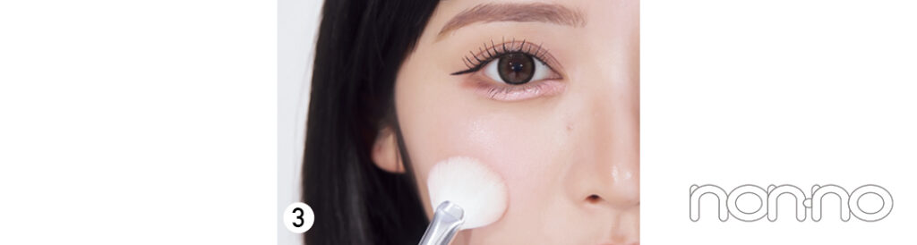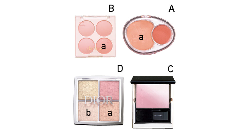 Dのaとbを混ぜて頬骨の高い位置に重ねる。頬骨に沿って、横長の楕円形にのせるとフレッシュな雰囲気に!