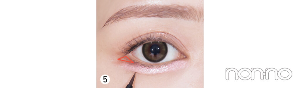 Dを③の上に重ねて、涙袋をピンクに色づけ。さらに黒目下にのみEを重ねて、うるキラな瞳に仕上げて♡