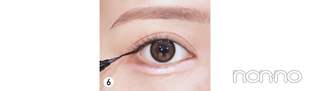 Gで上まぶたのまつげの隙間を埋めていく。目尻はやや下げぎみに長くのばすと、目力がぐんとアップ。
