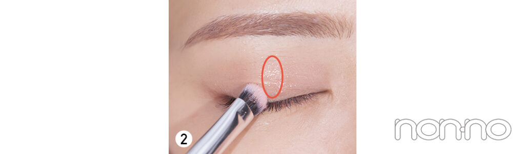 Cを混ぜてブラシに取り、①で塗った2色をなじませるようにふんわり重ねる。ハイライト効果で透明感も上乗せ。