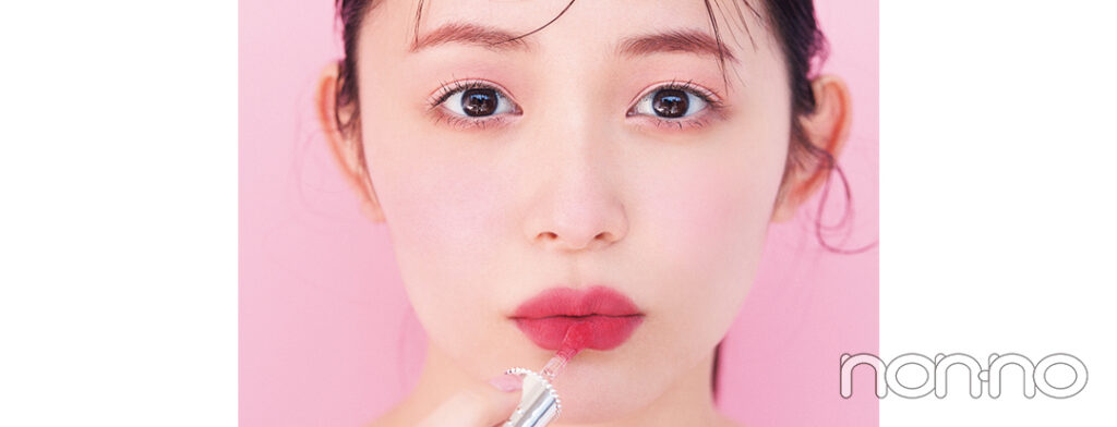 いちごピンクのリキッドルージュ(10)は唇の中央から外側へと広げてゆき、真ん中が一番濃くなるように。
