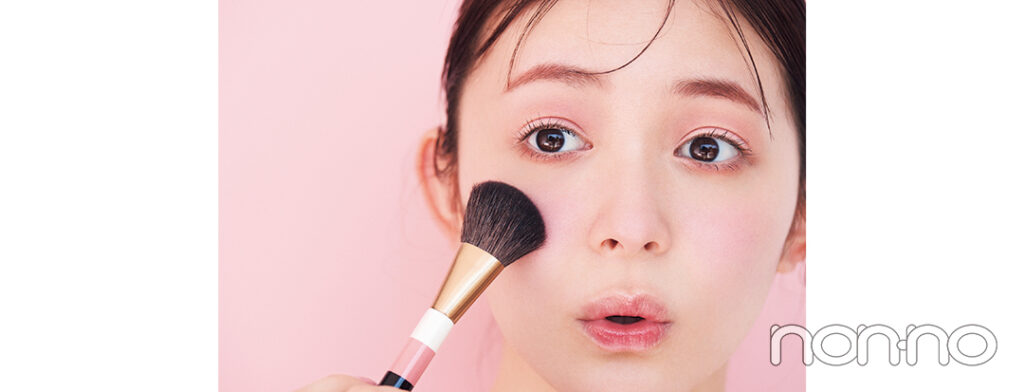 何もついていないブラシを鼻筋を横切るように往復させ、両頬のチークをうっすらつなげてベビみをプラス。