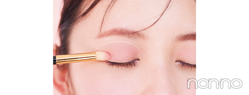 濃いピンクと淡いピンク(3)をブラシで混ぜ、目のキワからアイホールのくぼみを越えるくらい広めにのせる。