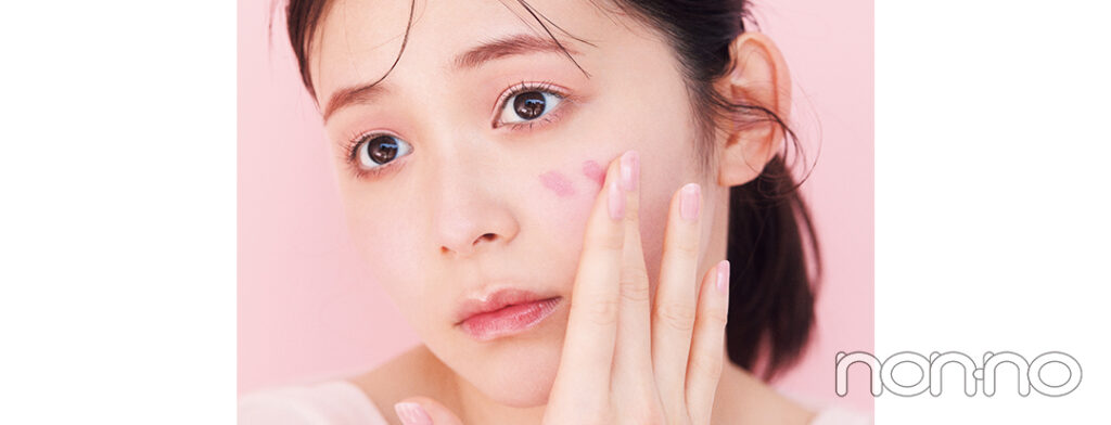 肌なじみのよいコーラルピンク。すりガラスのように色づいて毛穴や凹凸も目立たなく。