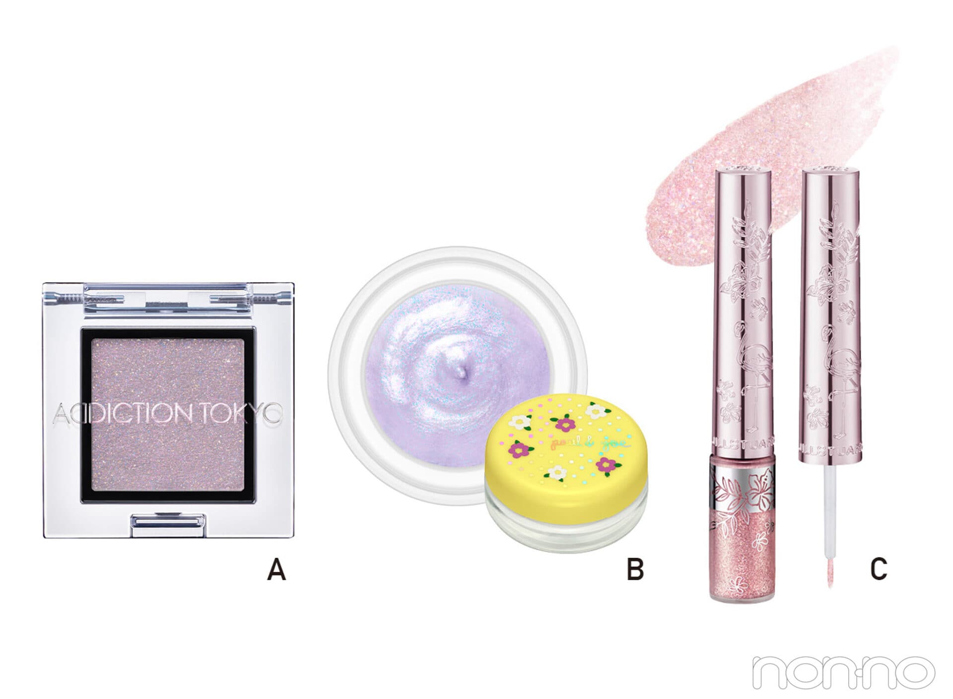 A ゴールドやプルーの光が透明感をくれる、モダンなライラックピンク。ザ アイシャドウ プリズム 104PR ¥2530/ADDICTION BEAUTY(限定品) B ウォータージェルベースのペールブルー。瞳をうるうると照らし出し、白目を澄みきった印象に。ジェリー アイカラー 001 ¥3080/ポール & ジョー ボーテ(限定品) C まばゆくもどこか儚げにキラめくグリッターピンク。アイダイヤモンド グリマー スパークル ピンクラグーン 13 ¥2750/ジルスチュアート ビューティ(限定品)