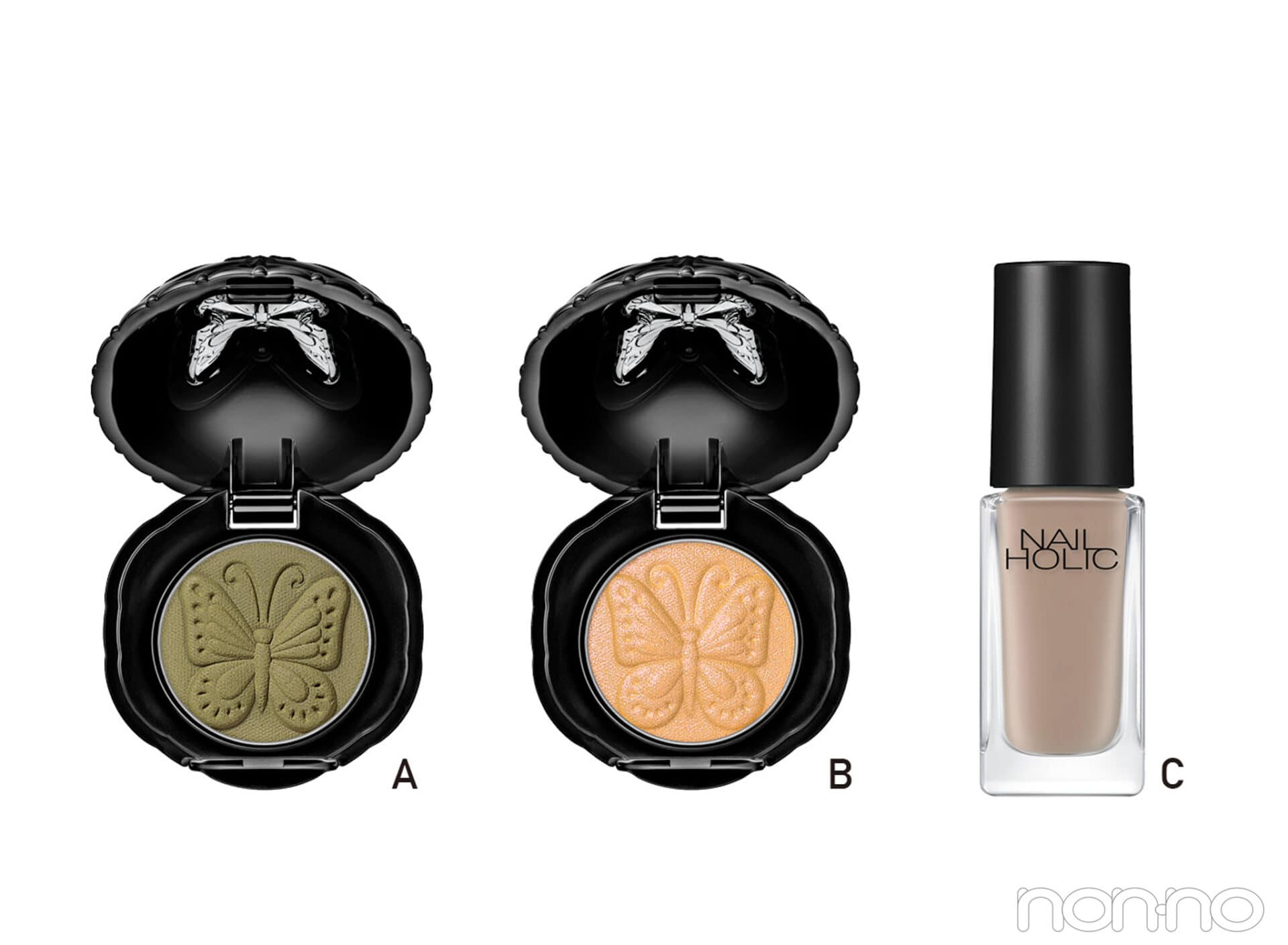 A ふんわり透けるマット感で、目元に深みと絶妙なニュアンスをくれるピスタチオカーキ。マット アイカラー 900 ¥2750・B 落ち着きのあるイエローに、赤や黄色の微細なパールを浮かべて。控えめだけれど味わいのあるハイライトに。シルキー アイカラー 800 ¥2750/アナ スイ コスメティックス C まるで爪のファンデーションのように手肌になじんで、指先をすらりと美しく見せる効果あり。ネイルホリック つめ用ファンデ+ BR026F ¥440(編集部調べ)/コーセーコスメニエンス