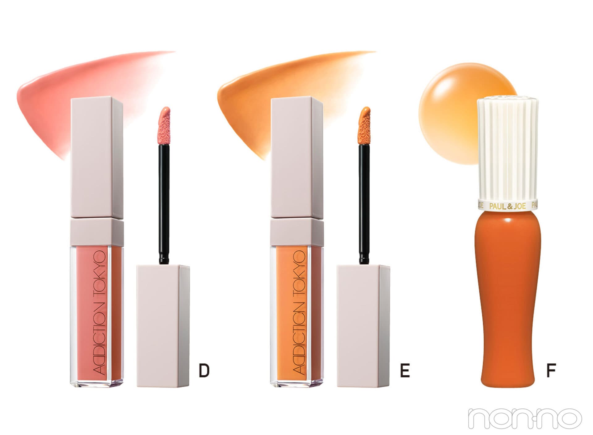 D ピンクニュアンスでほのかに甘さも感じるコーラル。ハリツヤを演出して頬がピンっと見えるのも魅力。ザ リキッドブラッシュ グロウ 001・E 肌になじみつつもスタイリッシュなムードを叶える、黄みを立たせたオレンジ。同 002 (各)¥3740/ADDICTION BEAUTY F 厚みのあるツヤ膜でぷっくり&ぽってりした印象的な唇に。グロッシー ルージュ 04 ¥3300/ポール & ジョー ボーテ
