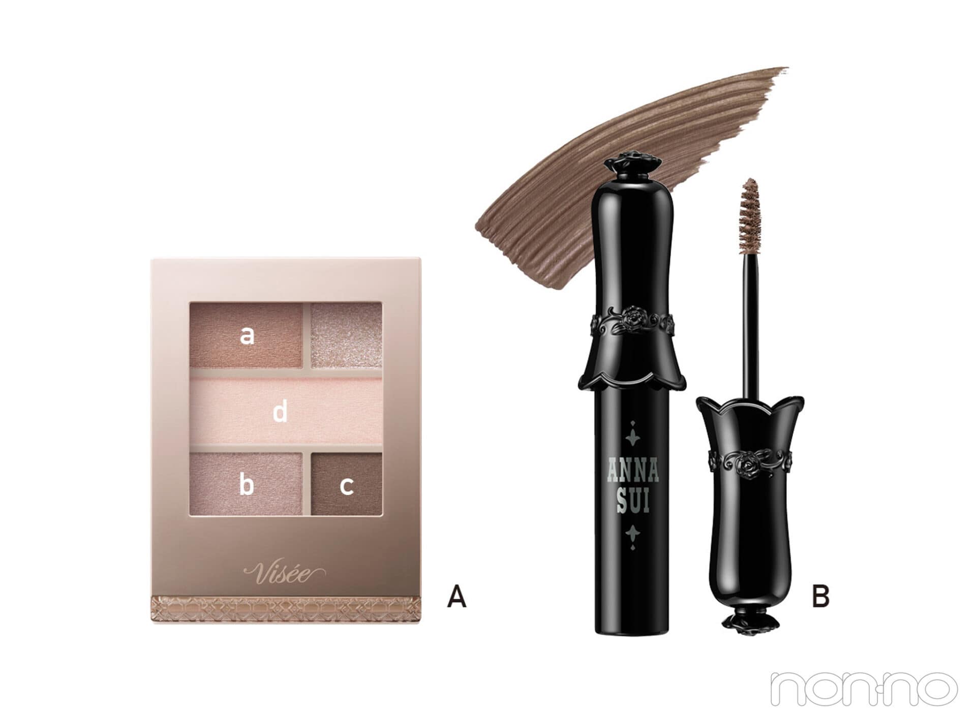 A ひときわモードな印象に仕上がる、グレイッシュなブラウン系。シアー・パーリィ・マットの異なる質感を重ねることで、まなざしに自然な深みと奥ゆきが生まれる。ヴィセ ダブル ムード アイズ BR-1 ¥1540(編集部調べ)/コーセー B 眉も目元とリンクしたグレイッシュなブラウンに染め上げて。毛流れを自在にスタイリングできてしっかりホールド。アイブロウ マスカラ 001 ¥3300/アナ スイ コスメティックス