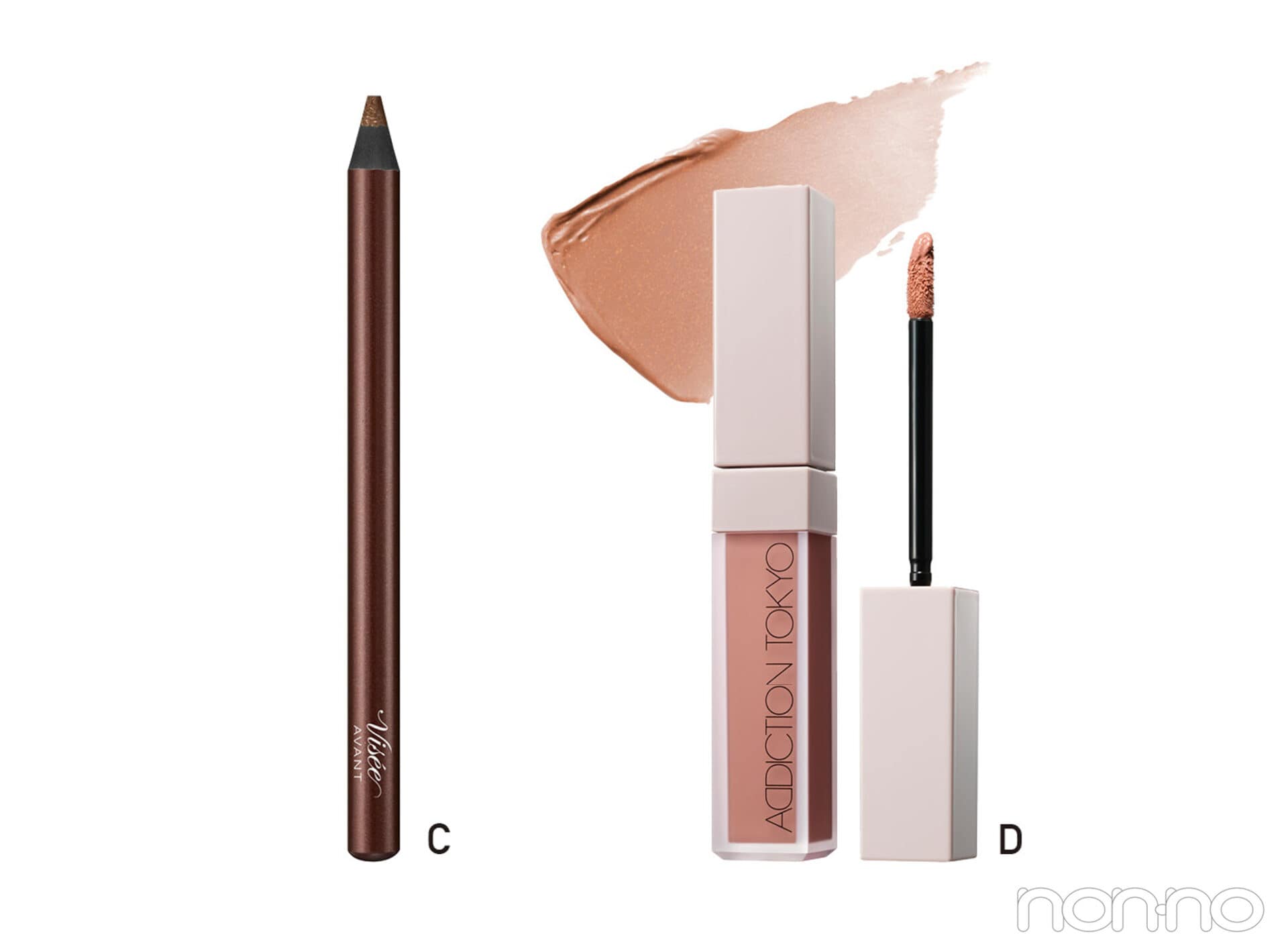 C キラめきが隠し味のブラウン。目元にも唇にも使える、一石二鳥のロングセラー。ヴィセ アヴァン リップ&アイカラー ペンシル 012 ¥1320(編集部調べ)/コーセー D ゴールドの光を潜ませたベージィブラウン。すりガラスのように“ほわっ”と色づき、毛穴の凹凸までも目立たなく。ザ リキッドブラッシュ フォギー 004 ¥3740/ADDICTION BEAUTY