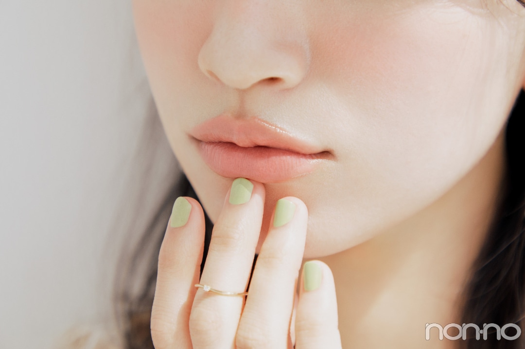 上唇の山を潰すように内側から外側へ直塗りして、じゅわんとした血色感を演出。美容液感覚でたっぷりとオンして。