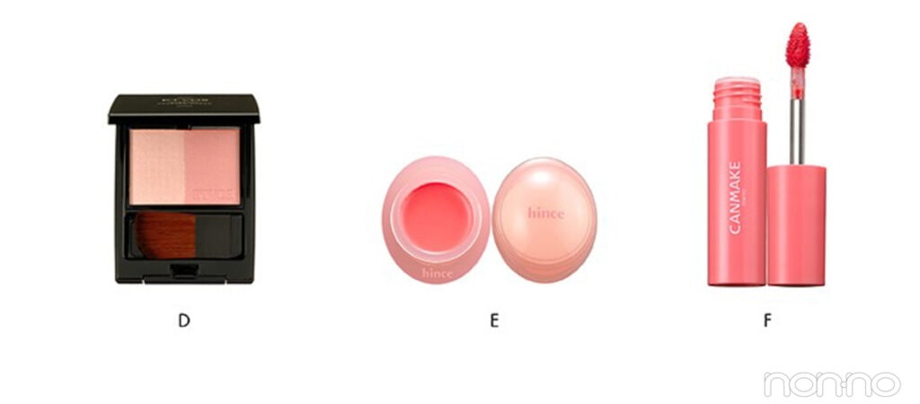 1 Bの赤枠で囲んだコーラルカラー3色をブラシに混ぜとり、頬骨の高い位置に横長に広げてから、さらに左右の頬のチークをつなぐように、鼻にふんわりとブリッジをかけるイメージで色をのせる。