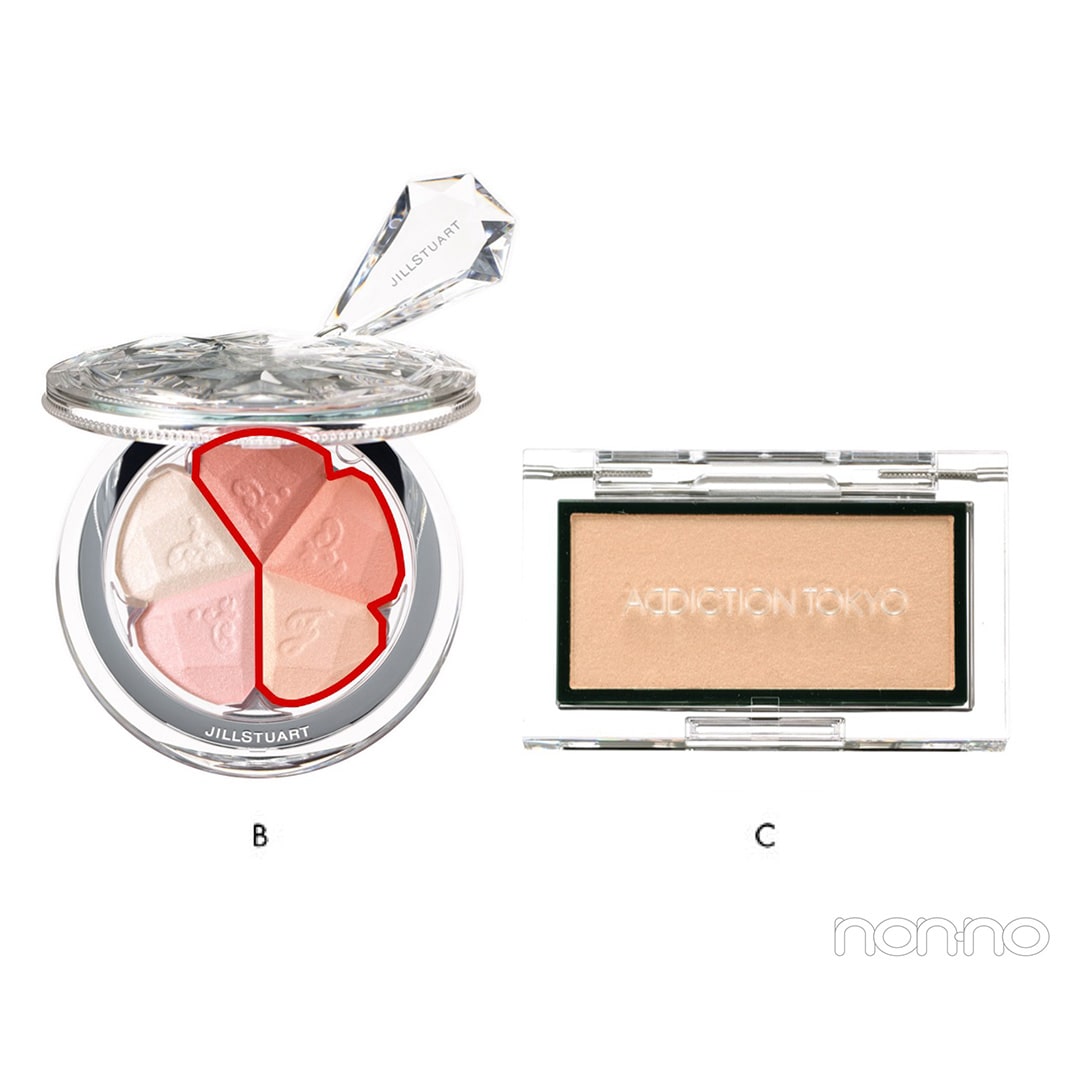 2 チークの横長入れで顔幅がのっぺり広く見えるのを防ぐため、頬骨が一番張り出した部分から逆三角形にCをのせて立体感をアピール。