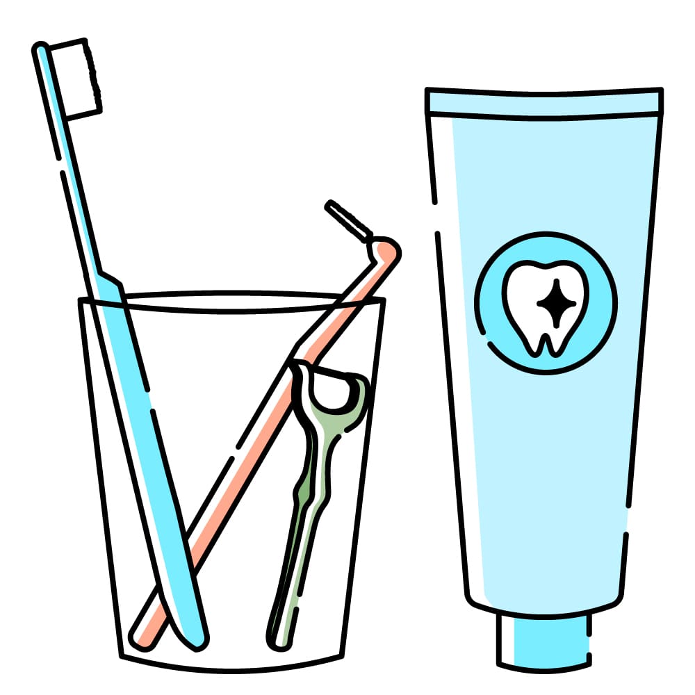 歯磨きセットは、フロス、歯ブラシ、歯磨き粉、マウスウォッシュ