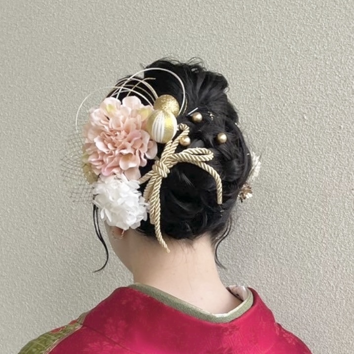 振袖の色に合わせて、正面からでも見えるように大きめの華やかなデザインにしました。