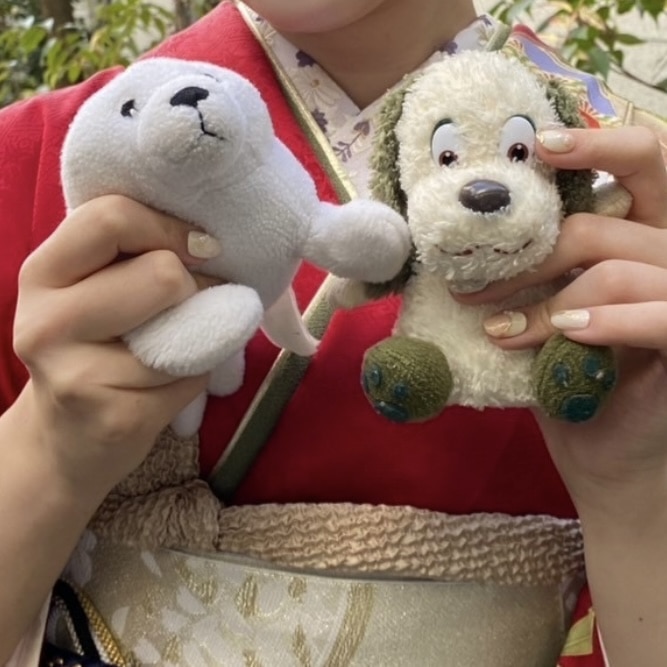 私は赤ちゃんのころから大切にしているワンワンのぬいぐるみと今でもベットに置いているあざらしのぬいぐるみと一緒に写真を撮りました。