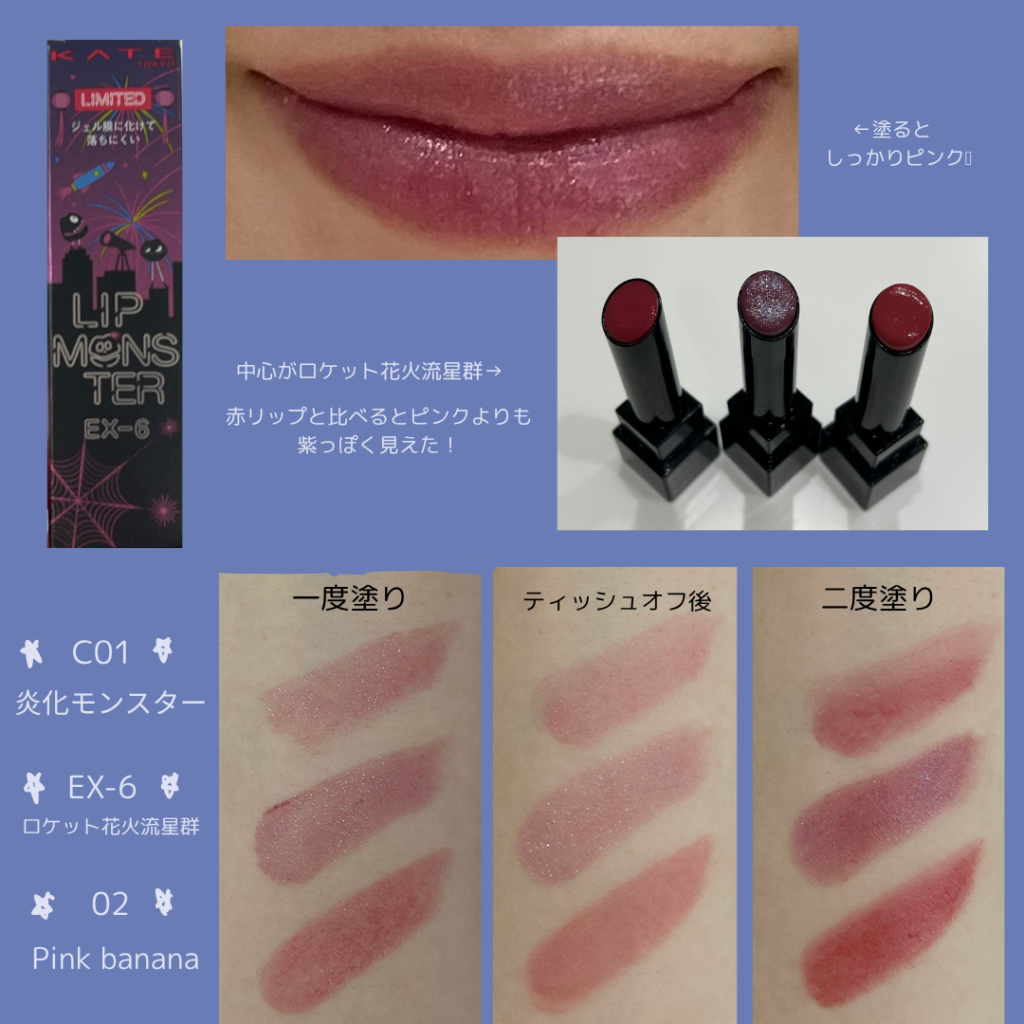 【色味】色の濃さは、カラー系統の違いかもしれませんが、pink bananaよりは薄めで、クリアトーンの炎化モンスター寄りに感じました。肌なじみが良いので、パールがたくさん入っていても派手になりすぎず、使いやすいと思います!