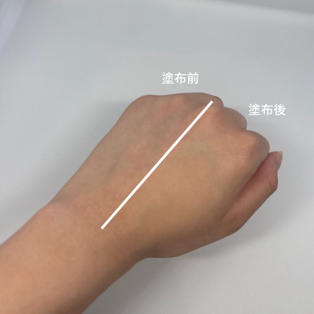 写真で見るとかなり暗めに見えますが、つけてみると暗すぎず、肌の色と良い感じに馴染みました。カバー力はすごく高いわけではありませんが、下地の上に薄い膜を張ったようなイメージで自然にカバーしてくれます。塗った後も乾燥せず、するすると伸ばせるので少量でかなりのびます。