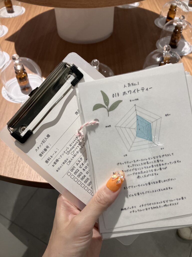 香りの「バランスシート」や店員さんのアドバイスを参考にしながら、じっくり選ぶことができます。