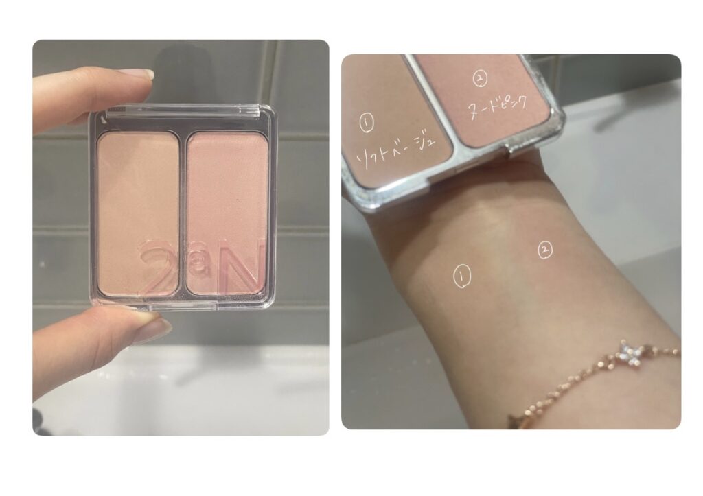 明るくてソフトなベージュとヌードピンクの組み合わせになっています🩷公式ではブルべ夏とイエベ秋におすすめとなっていますが、イエベ春の私がつけても自然な仕上がりになって良かったです♡流行りのモカムースメイクにもピッタリです☕️
